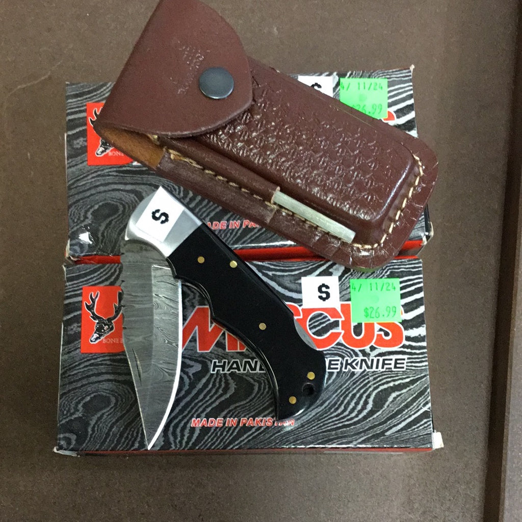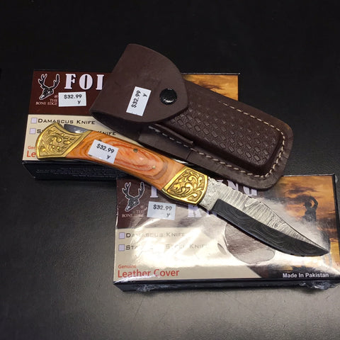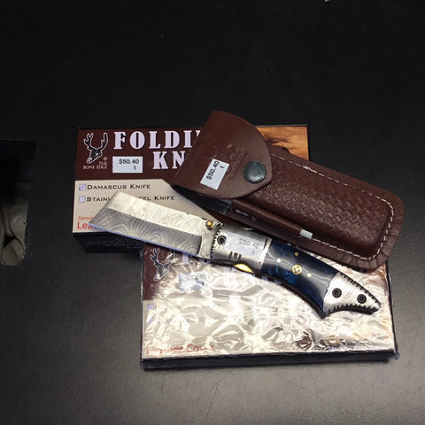 TheBoneEdge 7.5" Damascus Blade Folding Knife Brown Horn Handle Handmade Sheath - $50.99 USD
