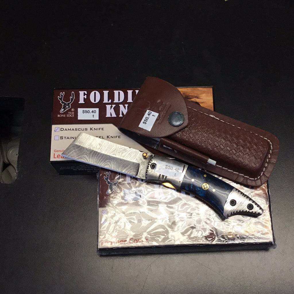 TheBoneEdge 7.5" Hand Made Damascus Blade Folding Knife Blue Resin Handle With Damascus Bolster - $43.99 USD
