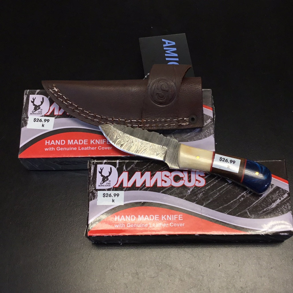 TheBoneEdge 6" Blue/Yellow/Brown Handle Damascus Blade Hunting Knife With Sheath - Sold Out